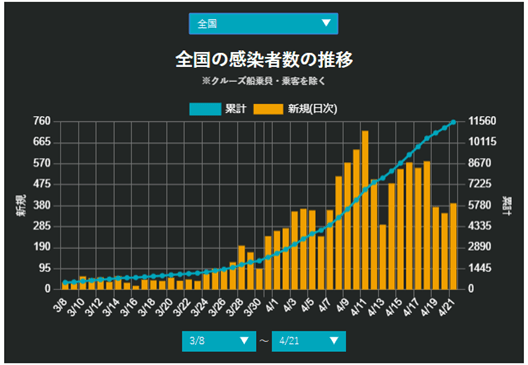 2020年4月21日までの感染者数の推移である。4月11日をピークに全体的に下降傾向にあるように見える。