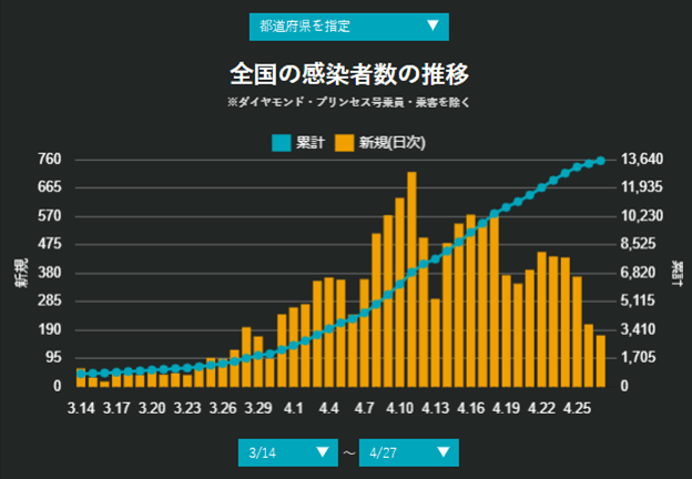 自粛することは、今の状況では致し方ないが、ほとんどすべての企業の営業停止や自宅から外に出るな、という要請をますます強めるのははいかがなものか、と思う。というのは、自分自身が守れそうもないからである。散歩もジョギングもできず、スーパーマーケットも自粛して営業日数を減らせとは、庶民の生活はできないことになる。生活ではなく、生きていけないことになる。10日間も家にじっと閉じこもるのは、人間であることを止めることと同じくらい苦しく、独房に入ることと同じである。いろいろな歪、家庭での息苦しさや子供たちの精神的・社会的な悪影響、夫婦間や親子間のストレス、これらの影響は、コロナ禍後の日本にとって重要な爪痕を残す。しかし、国民の命を守ることが重要だという論理には、その通りと言うしかないが、その土台となる人間はどう生きるのか、に目をつぶってはいけないのではないか。あまりにも代償が大きすぎる。下記のグラフのように、順調に感染者数は減っており、緊急事態宣言は効果を発揮している。油断すると言ってるのではない。精神的・社会的に健康であるという状態を維持することは、どのような緊急事態にも対抗できる強力な方法だと思うからである。